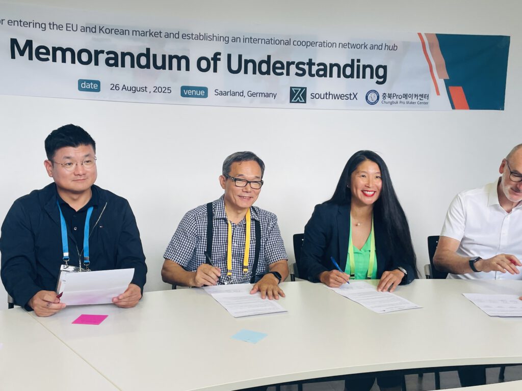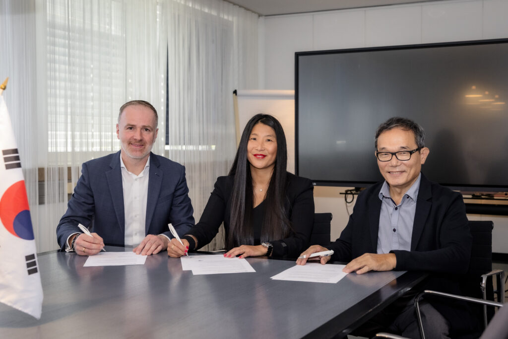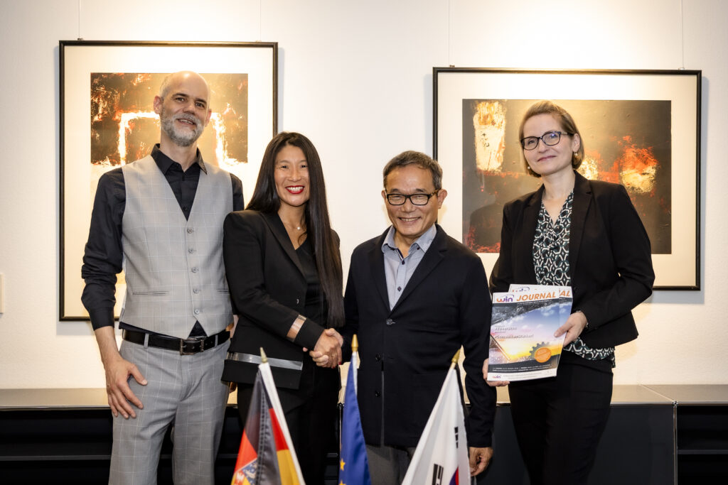 Unterzeichnung Memorandum of Understanding (MOU) mit der IHK Saarland, CBNU Chungbuk, i²Q.Konzept, (Bild v.l.n.r.: Dr. Frank Thomé, Julia Luckenbill, Prof. Yonggi Kim)